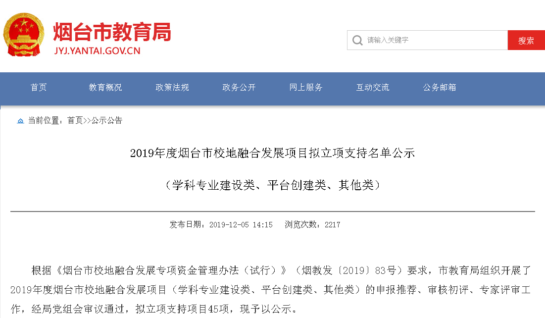 我院荣获2019年度烟台市校地融合发展项目立项