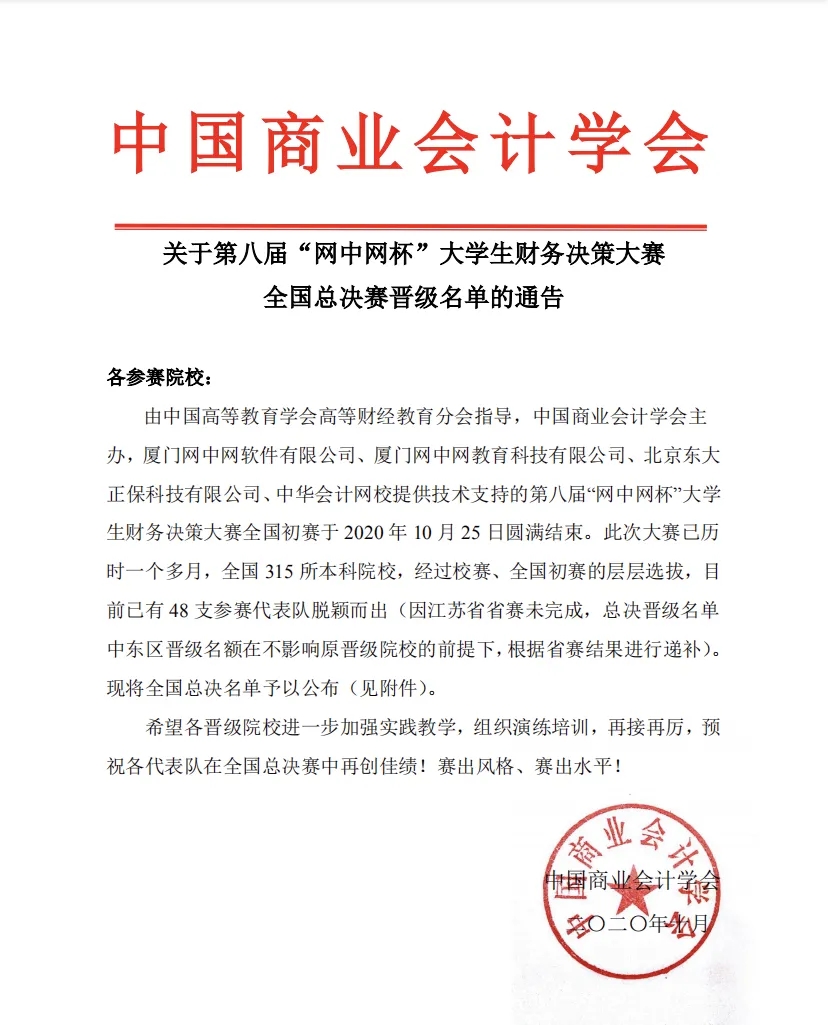 2020年10月,由中国高等教育学会高等财经教育分会主办,厦门网中网软件有限公司、厦门网中网财务技术有限公司承办的“网中网杯”大学生财务决策大赛大区赛圆满结束。本次大赛由来自全国的三百多所院校参加了比赛,我校代表队凭借出色的发挥,获得第八届“网中网杯”东区财务决策大赛一等奖,成功晋级全国总决赛。