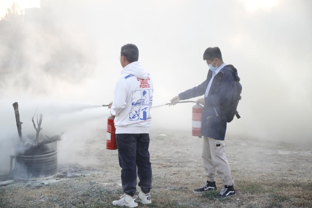 演练过程中,保卫部部长徐宝军、副部长赵彬现场指挥,王华峰老师介绍了突发火情如何正确拨打火警电话、如何应对初期火灾、灭火器的类型跟使用等消防常识,现场演示如何正确使用不同类型的灭火器。同时,还设立了四个真实着火点进行灭火器操作演练。