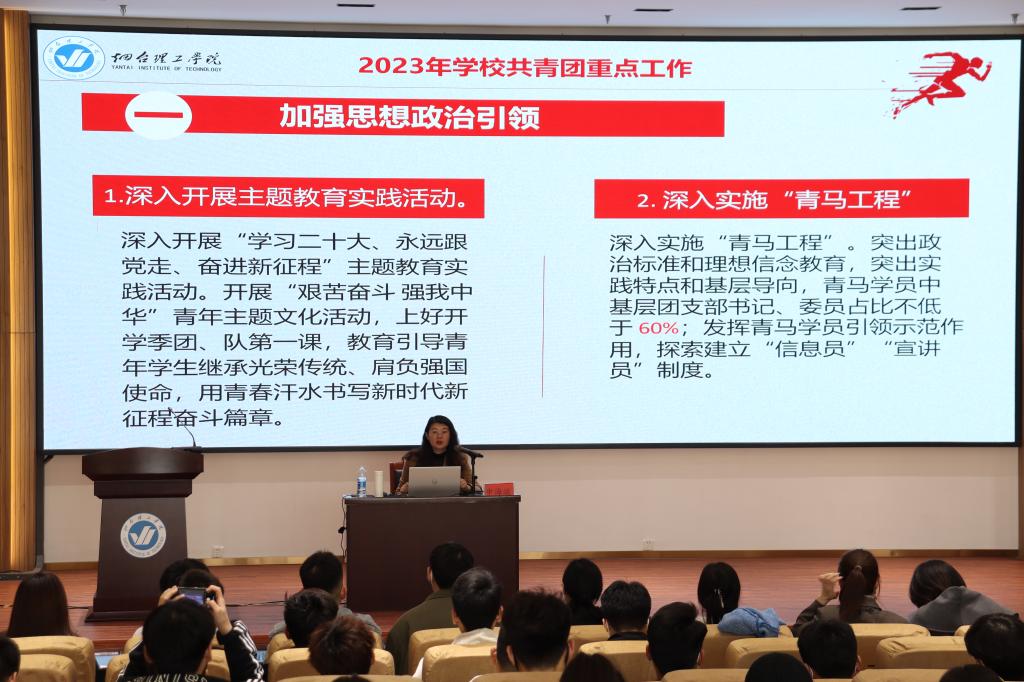 根据共青团山东省委关于开展“学习二十大、永远跟党走、奋进新征程”主题团队第一课的工作提示要求,3月10日中午,校团委在综合楼六楼报告厅开展党的二十大精神宣讲暨新学期共青团工作部署会。校团委书记申海滨担任主讲人,团委全体人员和全校团学骨干参加。