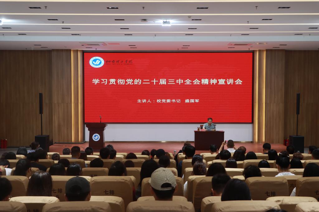 9月12日下午,烟台理工学院学习贯彻党的二十届三中全会精神宣讲会在综合楼六楼报告厅隆重举行,全体党委委员、二级学院院长、党团书记(副书记)等参加会议,党委书记盛国军作《深刻领会和把握党的二十届三中全会精神》专题宣讲,党委委员、组织统战部部长张琼玉同志主持会议。