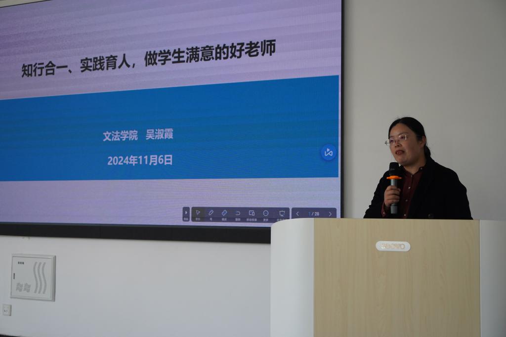 吴淑霞以《知行合一,实践育人,做学生满意的好老师》为主题,讲述了新时代师德师风的内涵界定,并结合法学专业实际,分享了自己在教学实践中的心得体会和经验做法,鼓励青年教师优化课堂教学内容,用实践促科研,寻找科研真问题。陈鹏程做《青春正向上,梦想有光芒》主题宣讲,以思政工作者的角度切入,列举了许多将思政内容融入育人工作的鲜活而有温度的事例,以坚守辅导员岗位的深刻感悟,生动诠释了教育使命和师德情怀。