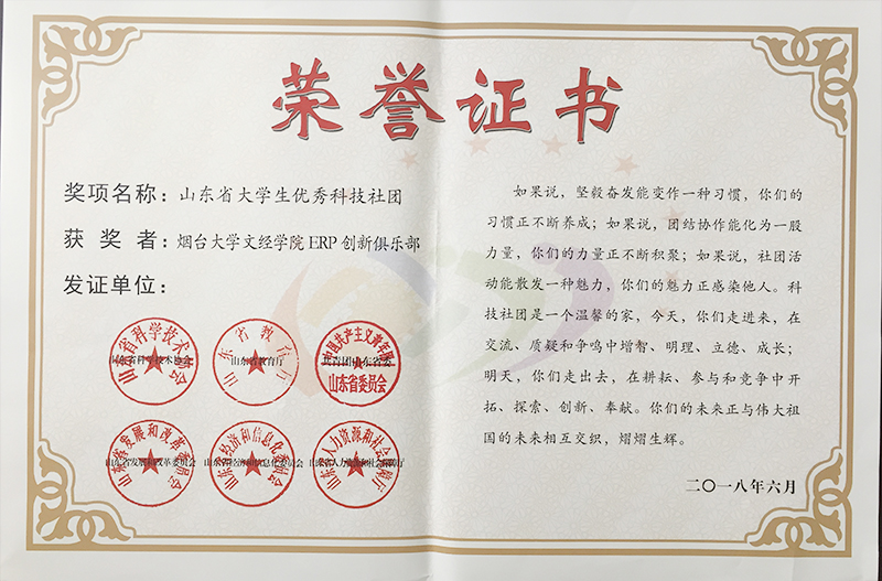 近日,由山东省科学技术协会与山东省教育厅、共青团山东省委、山东省经信委、山东省人社厅联合开展的2018年山东省大学生科技节优秀科技社团和优秀科技社团干部评选活动结果揭晓。我院“ERP创新俱乐部”荣获“2018年山东省优秀大学生科技社团”荣誉称号。“科技创新协会”会长王晓飞和“3D动力协会”会长郭港被评为“2018年山东省优秀大学生科技社团干部”。