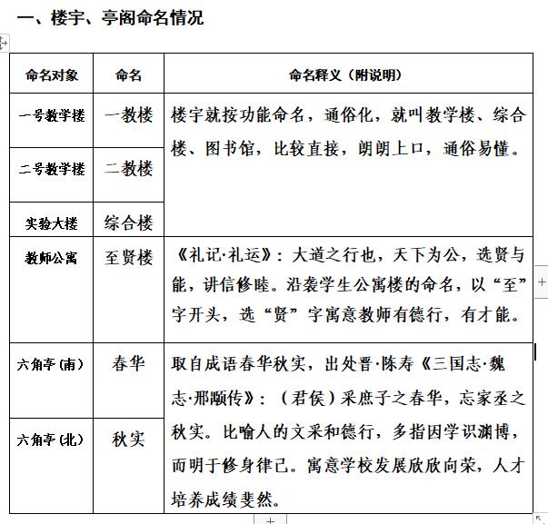 为加强校园文化建设,提升校园文化品位,凝练校园文化底蕴,充分发挥环境育人功能。2021年6月,学校启动了校园楼宇命名工作。经过广泛征集、深入调研、总结凝练,已确定了校内楼宇亭阁及道路的名称,并经校长办公会议审议通过。