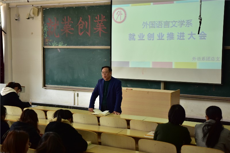 为正确引导外语学子对大学生就业创业形势的认识,增强就业观念,提高创业意识和积极主动性,3月25日下午,外语系于一教306教室组织召开了2019届毕业生就业创业推进大会。外语系党支部书记张廷国、团总支书记温少斐、国际交流学院肖恩霞老师、毕业班班主任及2019届全体毕业生参加了本次会议。
