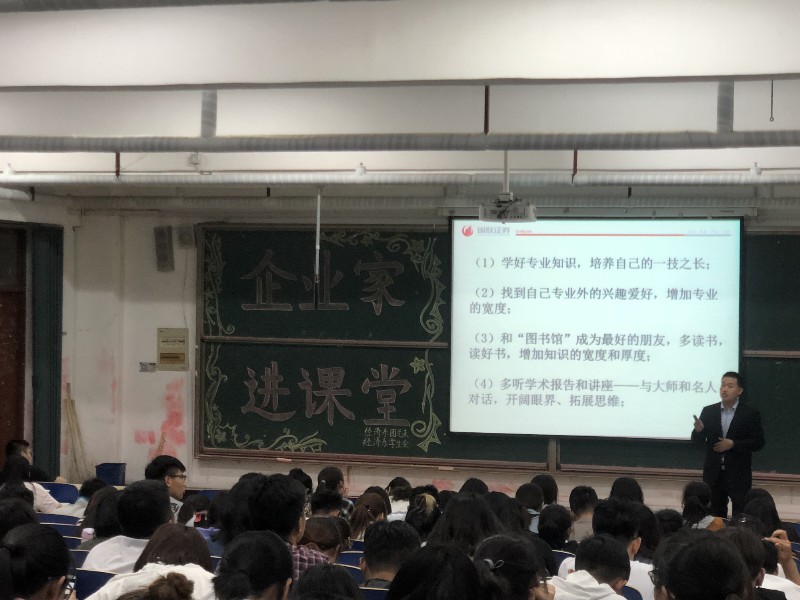 为了更好的提高经济系学生能力,满足个人发展战略的需要,拓宽学生知识面,营造全员学习的氛围,经济系于近期在一教101开展“企业家进课堂”的专业知识讲座,此次讲座由现国联证券股份有限公司(山东)财务公司业务部总经理张志国老师担任主讲。