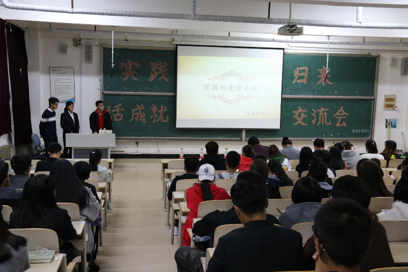 实践归来话成就,青春喜迎十九大。10月12日,管理系团总支于一教103举办了实践归来话成就交流会,管理系党支部书记杜娟、团总支副书记李昆峰以及姜静、韩聪聪、丁子钰、柳嘉靖老师出席会议。