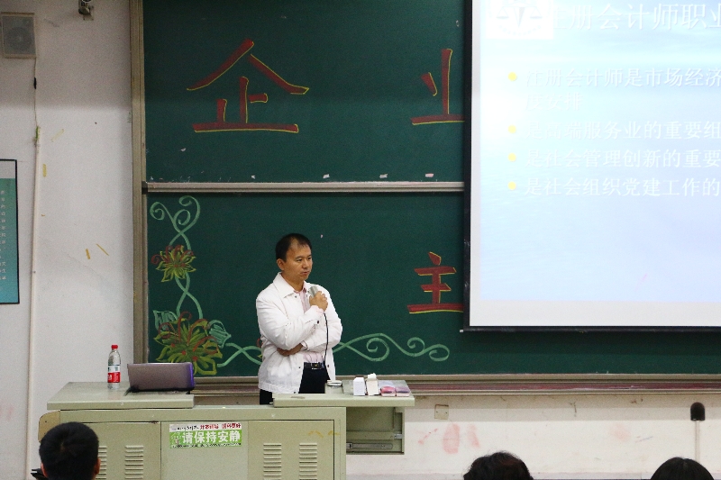 为增强会计系学生作为财会专业人员对注册会计师的认知,树立正确的就业观,10月21日下午,会计系企业家进课堂专题讲座于在一教104举行。刘刚博士担任本次讲座的主讲人。会计系主任孙桂娟、副主任孔令一出席讲座。