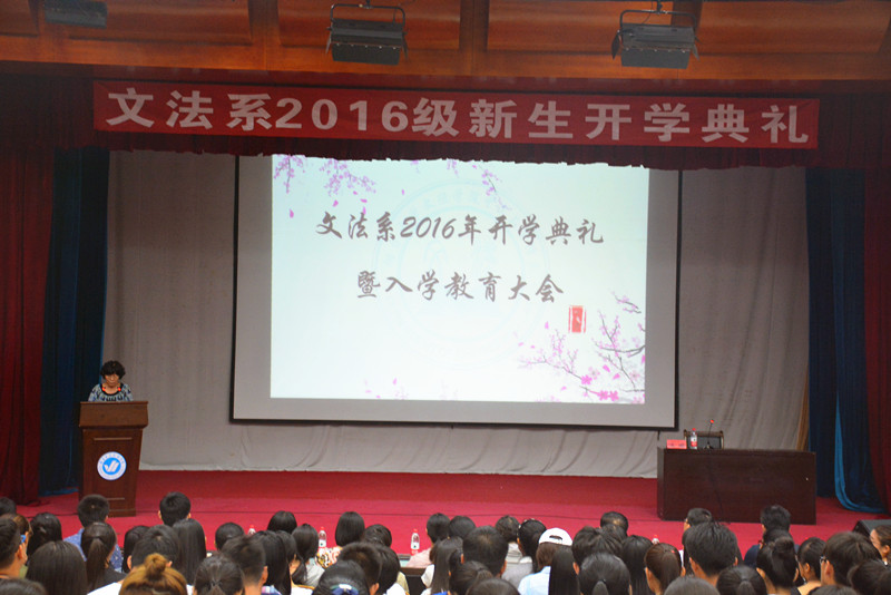 9月13日上午,文法系2016级新生开学典礼暨入学教育大会在一教多功能厅召开。文法系主任汤唯,主任教授阎幸福,党支部副书记曹钊庆,教师教学发展中心副主任林晓燕,文法系办公室主任米真,中文教研室主任林莎,新闻教研室主任张海燕等老师出席。会议由文法系党支部书记王淑霞主持。