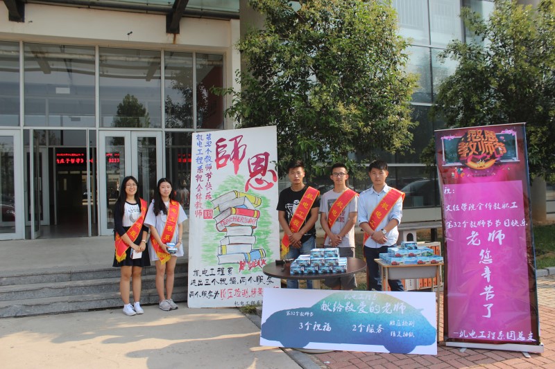 为庆祝全体教师第32个教师节,感恩教师淳淳教导。9月9日,机电系学生开展“三个祝福,两个服务”教师节答谢师恩活动。