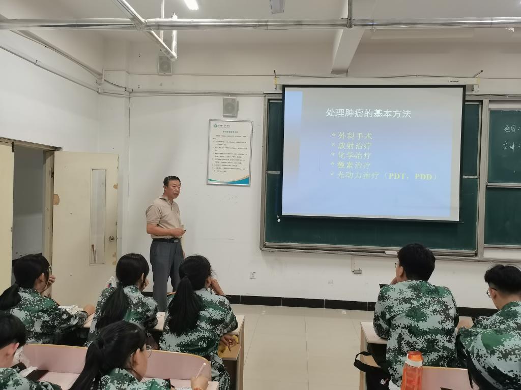 王教授以现阶段治疗肿瘤癌细胞的常见方法作为引入,介绍了光动力的概念、发展和基本理念,对肿瘤癌细胞为何自早期很难被发现做了讲解,引出光动力治疗。接下来,王教授围绕光动力治疗的核心——光敏剂,向同学们展示了光敏剂的作用、结构、反应条件和PDT如何失去效用,以及光动力治疗在猫和人身上取得的临床实验成果。此外,王进军教授还给大家展示了叶绿素类二氢卟吩合成与应用研究。讲座最后,新生向王教授就专业方向选择提出了问题,王教授对问题一一进行解答。