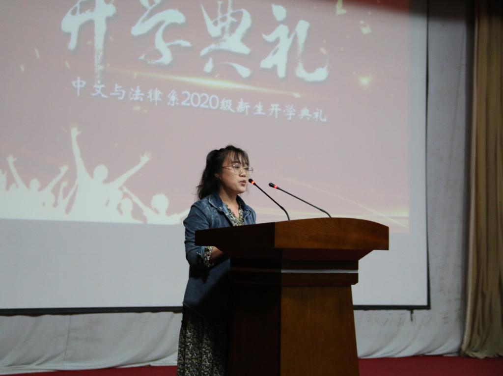 中文与法律系党总支书记曹钊庆致辞指出,同学们应当志存高远,胸怀家国,求真务实,学习创新,不负韶华,只争朝夕。教师代表郑新飞表达了对新生的期许,希望新生们能够带着敬畏之心对待时间、对待专业,不让大学生活留下遗憾。老生代表成晓悦以“坚守”二字为题,呼吁同学们在接下来的大学生活中坚守青春使命、坚守学习劲头、坚守良好习惯。新生代表董睿智表达了对大学生活的向往,以及对未来的规划和展望,彰显了新时代青年的信念与担当。
