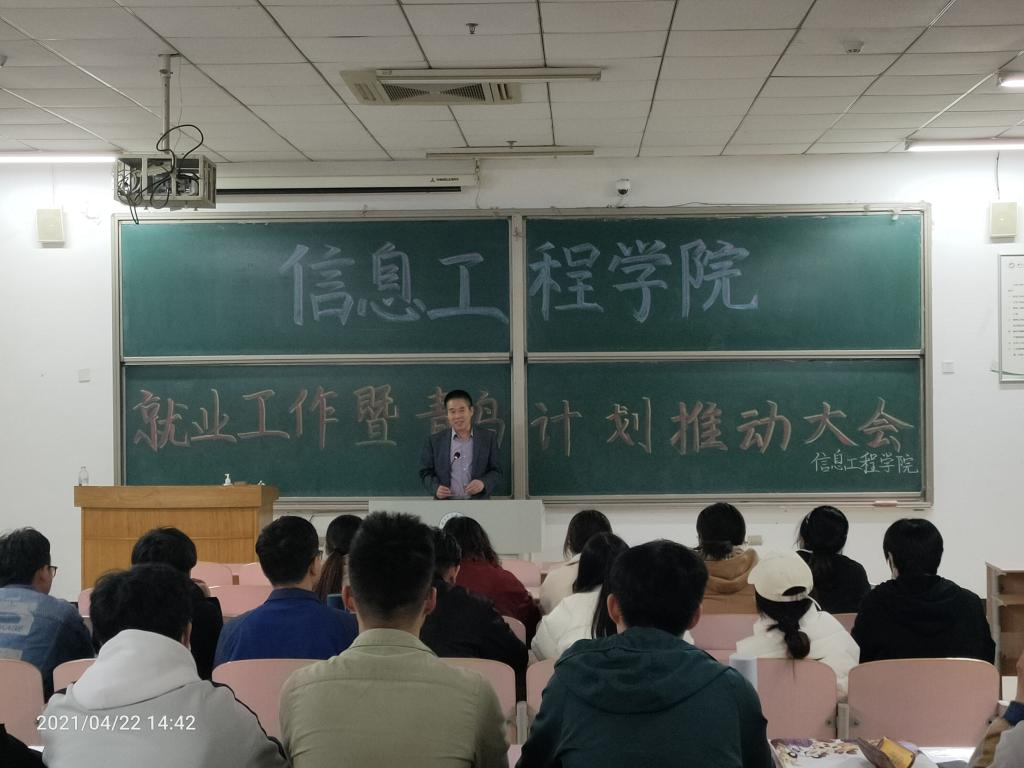 为进一步落实我院毕业生就业工作,切实解决目前存在的实际问题,抓实抓细毕业生就业去向,4月22日下午,信息工程学院在二教A113召开2021届毕业生就业工作暨“青鸟计划”推进会。此次就业工作推进会由辅导员赵怡老师主持,信息工程学院院长宋宜斌老师、党总支副书记王明印老师、就业指导中心褚亮辉老师、团总支书记祝箐老师及学院全体毕业生参加。