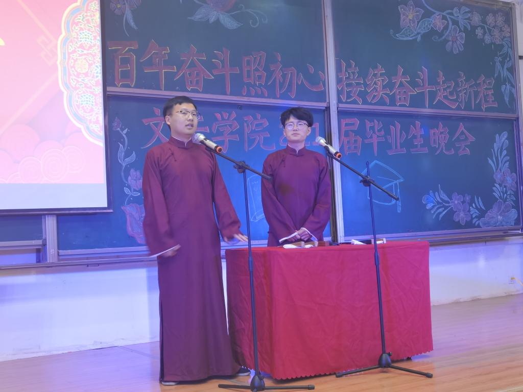 本次晚会共分为“栉风沐雨传承红色基因”“奋斗青春笃定前进航向”“初心永挚逐梦崭新未来”三个篇章。晚会首先通过视频的形式回顾了21届毕业生四年的大学生活,随后通过歌曲、舞蹈、话剧、相声、走秀等多种节目形式表达对毕业生的祝愿。开场曲国乐合鸣《破阵乐》点燃了现场的气氛;话剧《智取威虎山》展现党员豪情;舞蹈《沂蒙女儿》致敬百年峥嵘;歌曲《新征程》聚焦十四五,擎画中国号蓝图;舞蹈串烧《Lip&Hip》《we rock》活泼热烈,欢乐气息弥漫会场;歌唱表演《想把我唱给你听》展现了懵懂美好的校园情谊;反串走秀点燃全场,引起阵阵欢呼。晚会过程中,毕业班班级负责人为班主任送上献花与礼物,他们最后一次以文法学院学生的身份与老师合影留念。最后,一首《不说再见》将晚会拉向高潮,本次晚会圆满落幕。