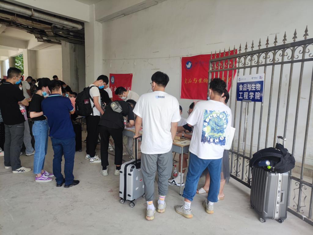 食品与生物工程学院迎新的志愿者们在学校门口等待新生的到来,帮助新生搬运行李、介绍校园环境、解答新生问题,让新生可以进一步加深对学校的了解。志愿者们热情周到的服务,温馨甜蜜的笑容更是让同学们真切感受到来自学校的温暖,来自志愿者的关怀。