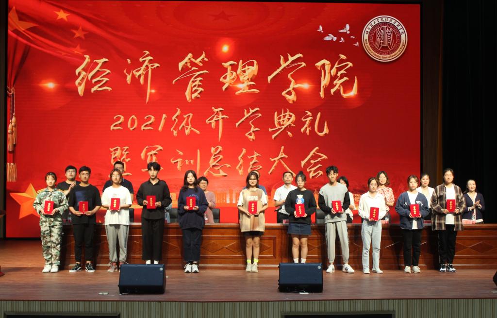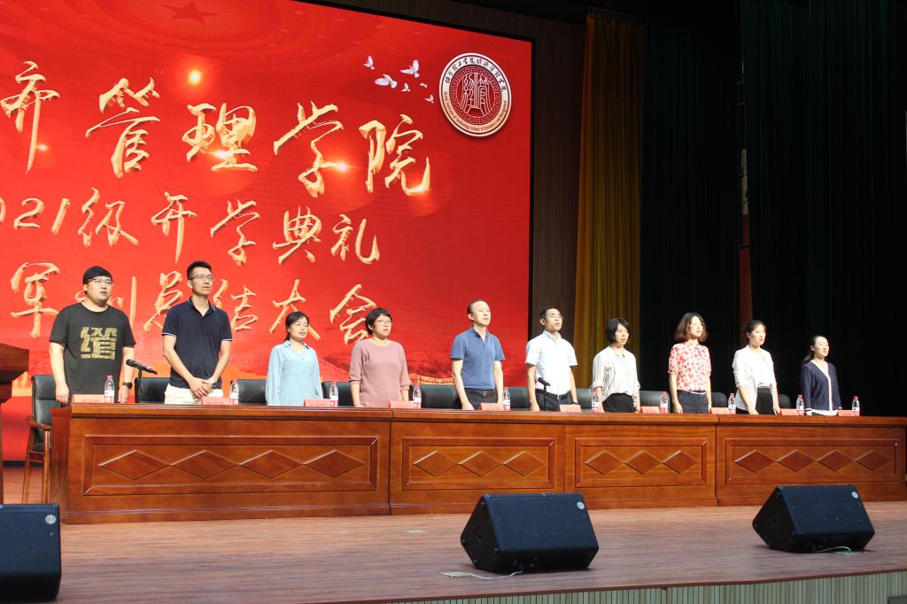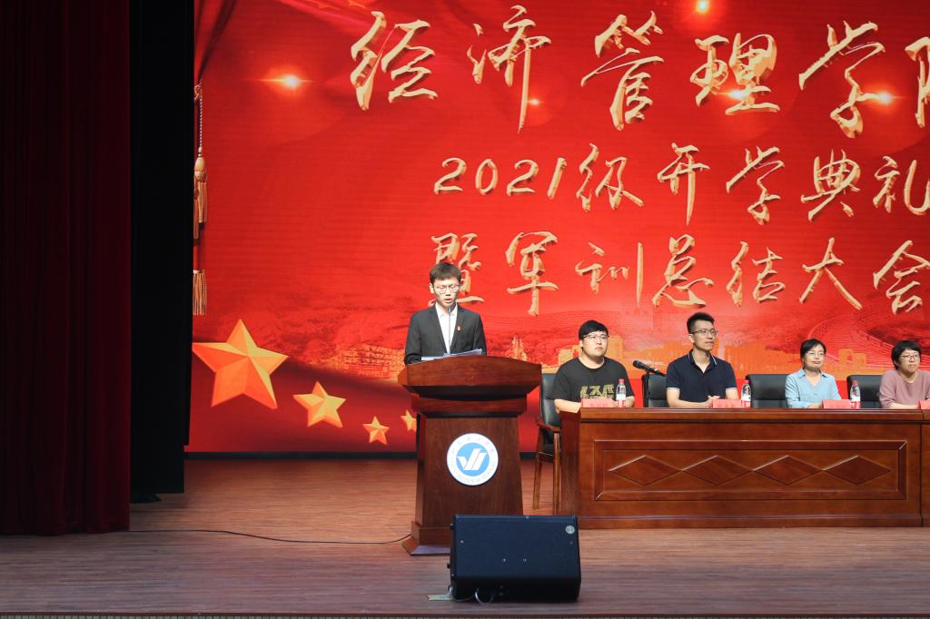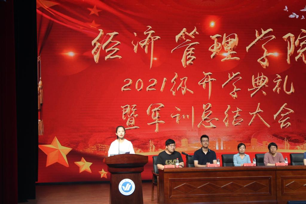 为总结新生军训成果,帮助新生树立新目标。2021年9月24日于实验大楼多功能厅开展21级新生开学典礼暨军训总结大会。经济管理学院院长、党总支书记高照龙、副院长孙相云、副院长殷晓彦、团总支书记李昆峰、国际经济与贸易系主任孙少叶、人力资源管理系主任张俊、跨境电子商务系老师刘娜娜、工商管理系主任姜琳、市场营销系主任郭承鑫以及任课教师、辅导员、2021级新生班的各位班主任老师出席本次大会,大会由团总支书记李昆峰主持,全体新生积极参加。