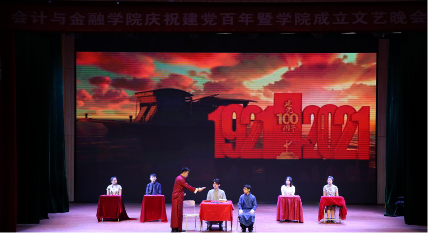 2021年12月15日晚,会计与金融学院于综合楼一楼报告厅举办庆祝建党百年暨学院成立文艺晚会。副校长张仁杰,校长助理莫红菊,校团委书记申海滨,经济管理学院党总支书记高照龙,组织统战部副部长温少斐,文法学院党总支副书记王晓黎,食品与生物工程学院党总支副书记赵蓓,会计与金融学院院长孙桂娟、党总支书记曹钊庆、副院长孔令一,以及会计与金融学院全体教工参加。