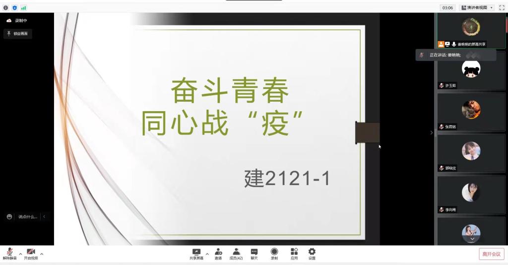 为贯彻落实学校关于疫情防控工作的部署和要求,加强疫情防控期间学生的思想教育和价值引领,保障学校正常秩序。建筑工程学院积极响应防疫号召,以提高师生的防范意识,保证师生身心健康,营造良好校园环境为目的,组织各班开展奋斗青春、同心战“疫”线上主题班会。