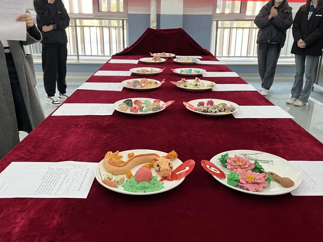 比赛即将开始,参赛选手依次进入比赛场地,现场秩序井然,选手们摩拳擦掌,蓄势待发。在学生会主席详细讲解比赛规则后,比赛在紧锣密鼓的氛围中正式拉开序幕。每位参赛选手都以认真的态度、饱满的热情投入到比赛中去,揉面、雕刻、塑造、成型,绚丽的配色、精美的摆盘、精湛的工艺......不一会儿,琳琅满目的作品在经过参赛选手们的精心制作后,以完美的状态呈现在大家面前,绽放的花朵栩栩如生、腾飞的巨龙惟妙惟肖,在场观众都赞不绝口。随后,评委们注重参赛选手基本技能、专业素养、食安意识等方面的综合考核,从作品的造型、创意、摆盘等餐饮美学的角度进行客观平正的打分。最后,食2151-1班作品“传统工艺面食”获得一等奖,作品“花间灿漫”“百雨金娇耳”获得二等奖,作品“暮里花开”“富贵有余”“香美园”获得三等奖,“花海云月”“雨露均沾”“什锦面食”“月牙顶”“一个棒子”获得优秀奖。