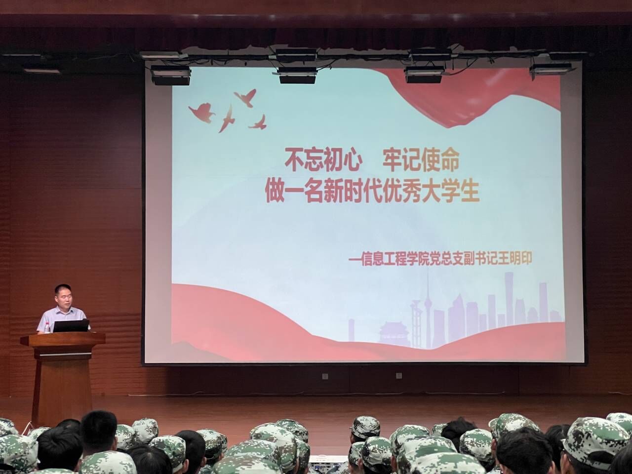 为传承红色血脉,坚定理想信念,信息工程学院于9月6日在一教207开展“不忘初心,牢记使命,做一名新时代优秀大学生”入学教育讲座。本次讲座由信息工程学院党总支副书记王明印老师主讲,全体辅导员以及23级新生参加。