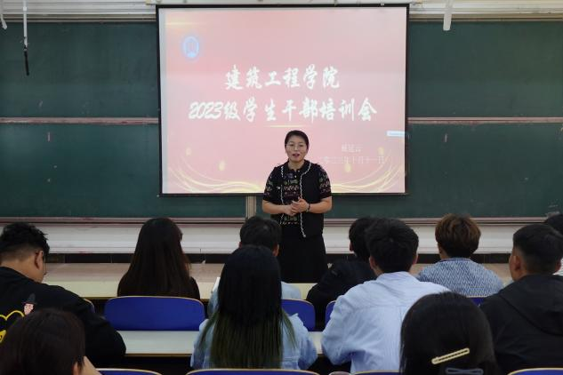 为加强学风建设,培养班干部团队协作能力,提高学生骨干工作能力,提高学生干部素质,更好地为学院、学生服务。建筑工程学院10月11日中午于一教楼101教室召开2023级学生干部培训会。本次会议由建筑工程学院党总支副书记臧延云主讲,新生辅导员安文静主持,2023级全体班级学生干部参加。