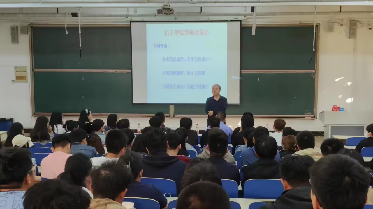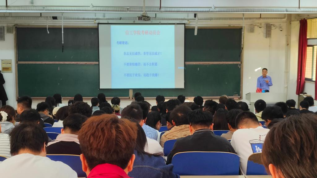 为坚定毕业生考研信念,发挥最大潜能,10月11日下午,信息工程学院于一教101召开考研动员会。大会由副校长兼学院院长王培进教授主讲,学院党总支副书记王明印、副院长原帅、团总支书记祝箐、全体辅导员、毕业生及大三学生参加会议。