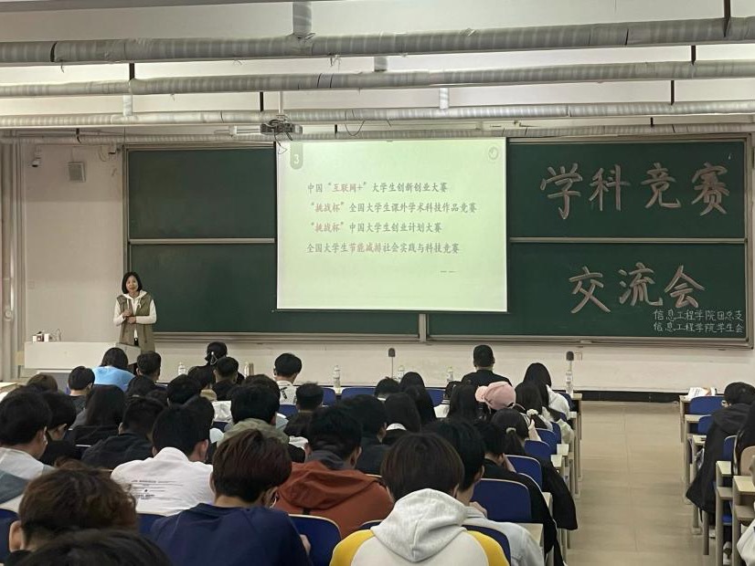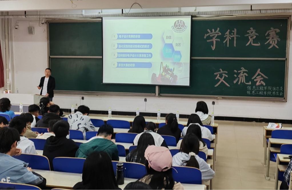 为加强学院学风建设,营造良好的竞赛文化氛围,激发同学们在学科竞赛中的创新能力,4月28日下午,信息工程学院于一教104组织开展学科竞赛交流会,各竞赛指导老师康凤、荆蕾、付斌、史晓明以及23级全体同学参加本次交流会。