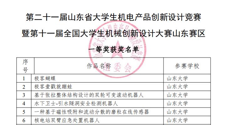 近日,第二十一届山东省大学生机电产品创新设计竞赛暨第十一届全国大学生机械创新设计大赛山东赛区决赛在齐鲁工业大学圆满落幕。由徐红梅和胡斌老师指导的参赛队伍普罗米修斯队(程涛、李凤英、秦明华、薛入瑞)荣获山东赛区一等奖。此外,徐红梅老师获得“优秀指导教师”称号。