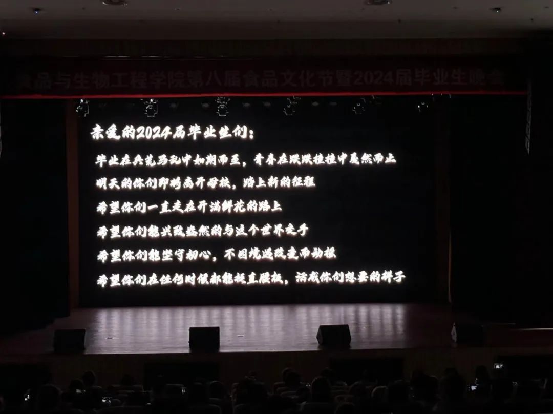 随着夏日的脚步渐行渐近,烟台理工学院迎来了一年一度的毕业季。在这个充满离别与希望的时刻,食品与生物工程学院隆重举行了第八届食品文化节暨2024届毕业生晚会。出席本次活动的有烟台理工学院副校长徐世艾,校长助理李洁、杜娟,团委副书记臧延云,外国语学院党总支书记赵蓓,国际教育学院党支部书记于丽方,食品与生物工程学院院长蒋小满,党总支副书记温少斐,副院长高娜、姜倩倩,团总支书记王晶及全体辅导员、毕业班班主任以及教师代表。