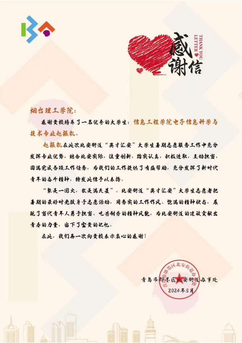 近期,信息工程学院收到一封来自山东省青岛市即墨区的感谢信。信中,北安街道办事处高度赞扬了信工学院学子赵振凯在参加“英才汇安”大学生暑期志愿服务工作中的奋斗精神和出色表现,同时向学校培养优秀人才表示衷心的感谢。