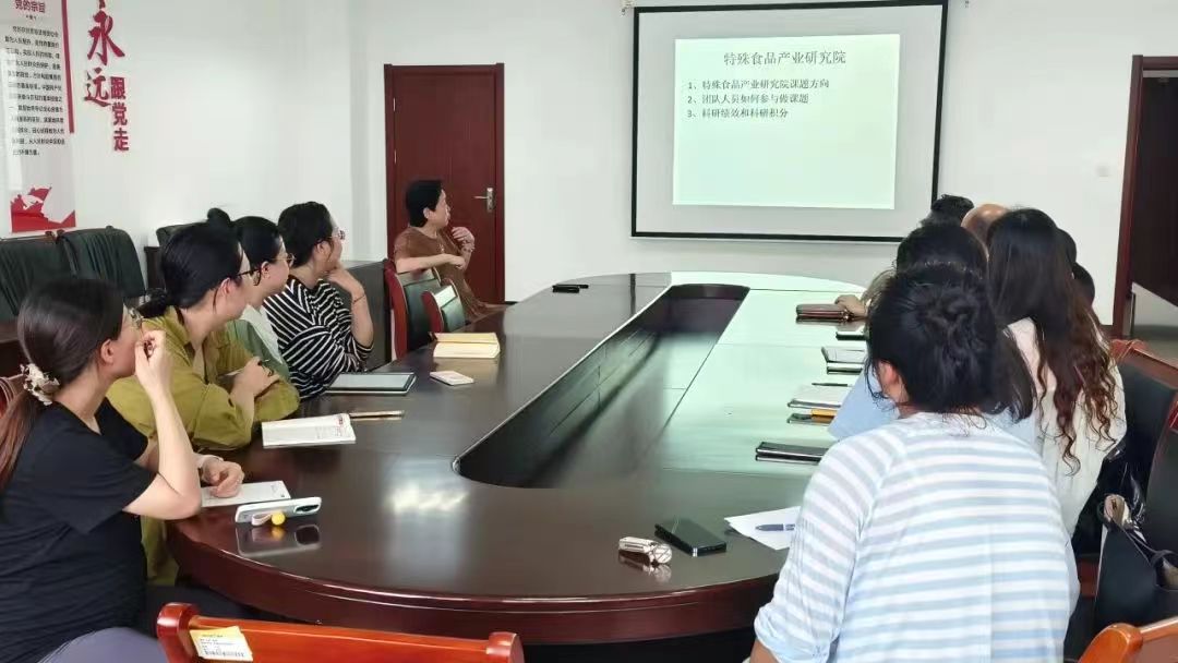 为推动特殊食品产业创新发展,提高科研意识,加强科研力量,9月19日食品与生物工程学院于综合楼s639召开特殊食品产业研究院团队科研指导会议,烟台市特医食品重点实验室首席科学家、烟台理工学院特殊食品产业研究院王晓洁教授以及相关人员参与此次科研指导会议。会议由王晓洁教授主持。