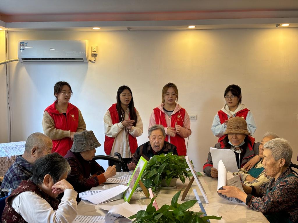 接下来,志愿者们跟随工作人员来到了“老年大学”活动室。这是一场特别的音乐会,志愿者们与老人们共同唱歌。当《南泥湾》的旋律响起,爷爷奶奶们认真地看着歌词纸,跟随着旋律哼唱着。虽然岁月在他们的身上留下了痕迹,但他们的歌声依旧动听、情感依旧充沛。志愿者们用歌声传递着对老人们的关爱,用旋律编织着温暖的气氛。随着活动的深入进行,志愿者们与工作人员一起给老人们喂饭。他们弯下腰,轻声细语地与老人交流,询问饭菜是否合口味。活动最后,志愿者们同养老院的工作人员一起合影留念。
