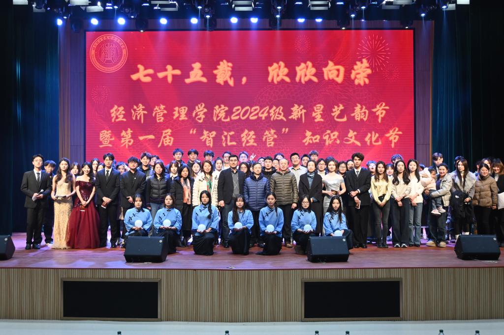12月6日,经济管理学院于综合楼一楼报告厅盛大举行“七十五载,欣欣向荣”新星艺韵节暨第一届 “智汇经管” 知识文化节。副校长苏春景,校团委副书记臧延云,招生就业处副处长褚亮辉,文法学院党总支书记曹钊庆,食品与生物工程学院党总支副书记温少斐,国际教育学院党支部书记于丽方,经济管理学院院长华吉鹏,党总支书记邓之增,副院长殷晓彦、王崇红及经济管理学院全体老师出席活动,共同见证这场文化与知识交融的盛宴。