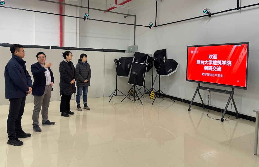 烟台大学一行考察了数字媒体艺术专业可视化交互媒体实验室,实验室负责人冷涵介绍了实验室内的光学动作捕捉系统、室内全彩LED裸眼3D屏幕、小型录音室系统、摄影摄像系统等一系列设备,并分享了实验室建设过程的相关经验。