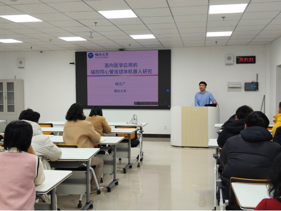 近日机电工程学院于综合楼S209 举办了一场推动学科交流与创新发展的学术讲座。此次讲座由烟台大学杨文广教授主讲,主题为“面向医学应用的磁控同心管连续体机器人研究”,机电工程学院全体教师参与此次讲座。