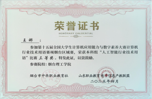 近日,第十五届全国大学生计算机应用能力与数字素养大赛计算机行业技术用语赛项烟台区域赛结果正式公布,人工智能学院收获多项荣誉。