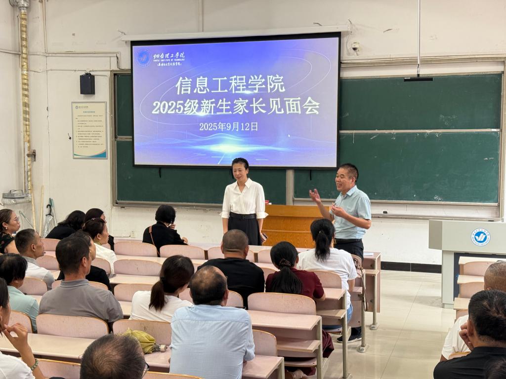 为深化家校协同育人机制,帮助家长全面了解我校育人理念与培养模式,9月12日下午,信息工程学院于二教111举行2025级新生家长见面会。学院党总支副书记王明印、副院长康凤,团总支书记祝箐及25级新生家长参加。