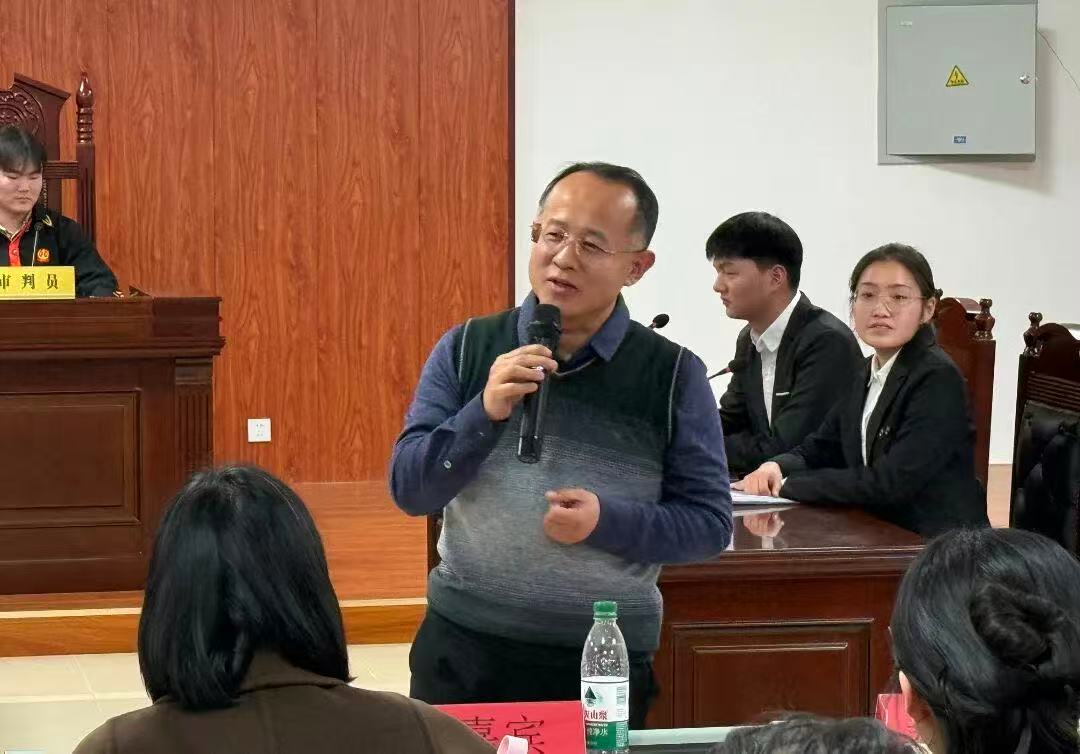 点评环节中,曲江主任结合二十余年律师经验,结合自身作为资深仲裁员和调解员的庭审经历,高度肯定了赛事中选手体现的专业水准,提出“辩之有据、辩之有理、辩之有情”的庭审辩论核心原则,还从实务沟通角度建议同学们把控发言语速、坚持脱稿表达,贴合庭审裁判者、书记员的工作节奏,提升主张的说服力与专业呈现效果。吴淑霞老师表示,模拟法庭作为“第二课堂”,我校已经是举办了十届校级比赛,作为专业学科竞赛,能够补足课堂理论教学短板,实现理论教学与技能训练的深度融合,同时指出,两场比赛中选手要更重视举证质证环节,强化证据法律思维。董晓丽老师肯定选手相较于省赛的进步,鼓励大一同学积极参与法治实践活动,深化对法律的理解。