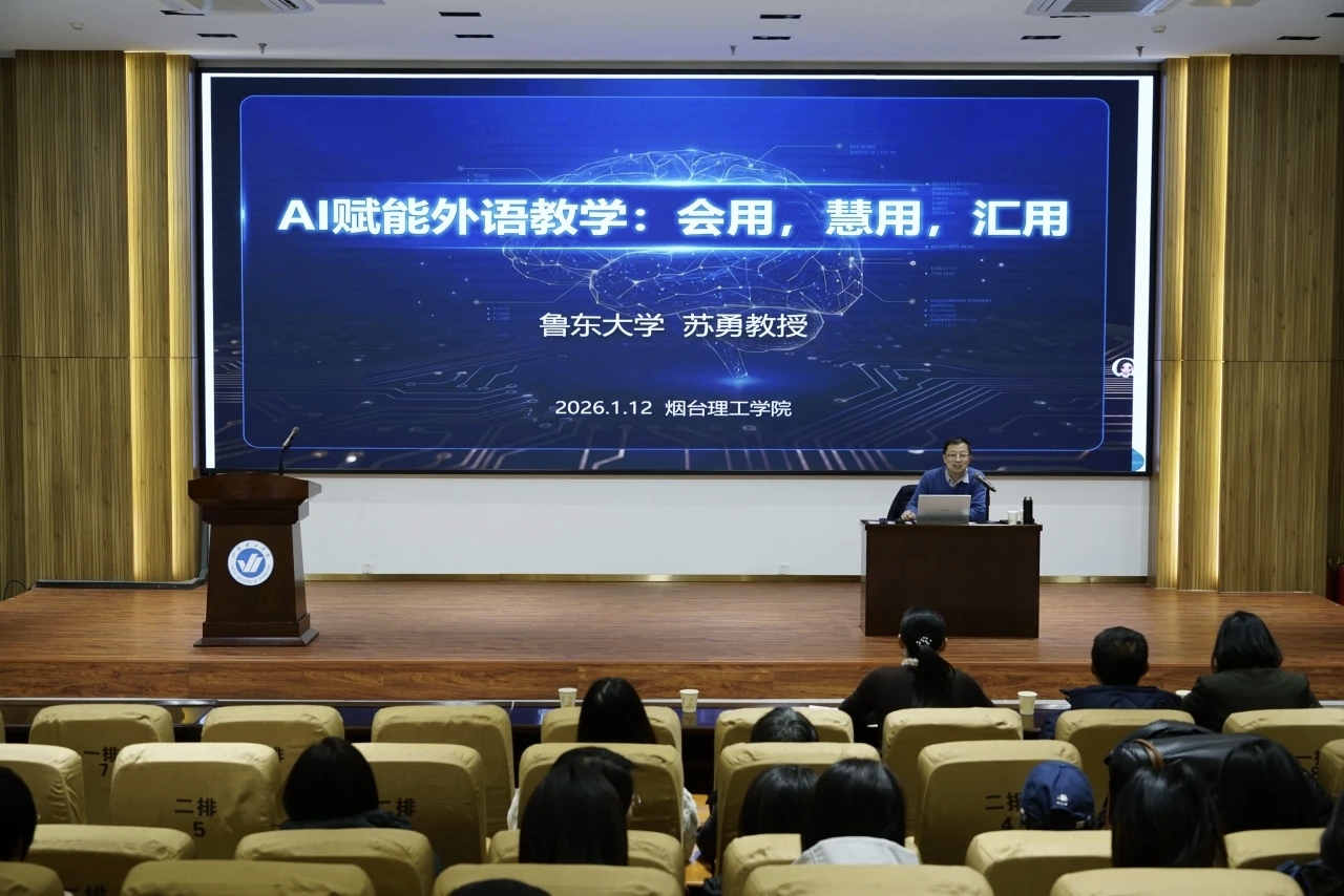 为深化国家教育数字化转型背景下的外语教学改革,提升教师队伍的人工智能素养与教学创新能力,1月12日,外国语学院特邀鲁东大学苏勇教授在综合楼报告厅作题为《AI赋能外语教学:会用,慧用,汇用》的专题学术讲座。外国语学院全体专任教师及其他学院部分教师参加了本次学习活动。